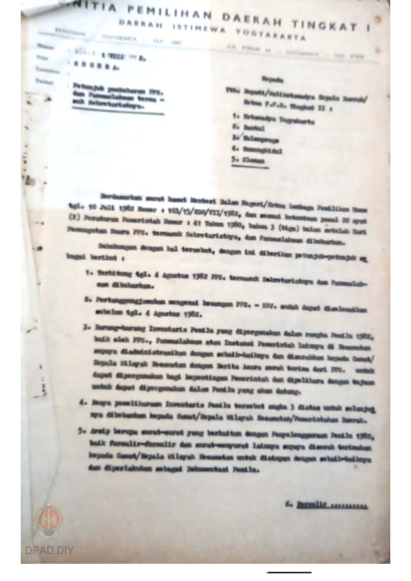 Surat Panitia Pemilihan Daerah Tingkat I DIY No.452/ LI/ VIII/ 1982 kepada Bupati Kepala Daerah/ Ketua PPD Tk II Kabupaten Kulon Progo tentang Petunjuk Pembubaran PPS dan Panwaslakcam termasuk sekretariatnya.