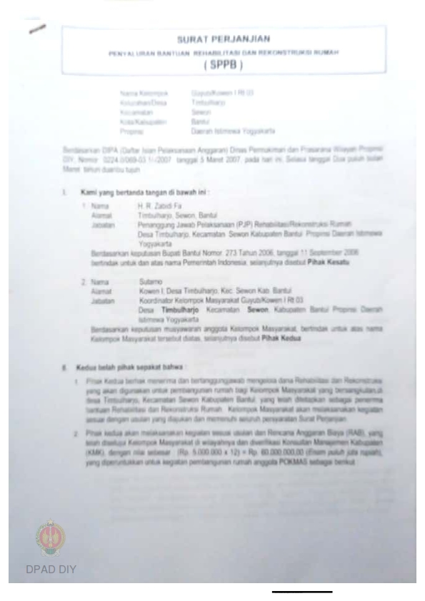 Surat Perjanjian Penyaluran Bantuan Rehabilitasi dan Rekonstruksi Rumah (SPPB), Nama Kelompok Guyub, Kel/Desa Timbulharjo, Kecamatan Sewon, Kabupaten Bantul, Propinsi Daerah Istimewa Yogyakarta