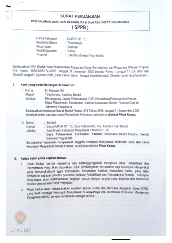 Surat Perjanjian Penyaluran Bantuan Rehabilitasi dan Rekonstruksi Rumah (SPPB), Nama Kelompok II Mrisi RT 04 dan RT 10, Kel/Desa Tirtonirmolo, Kecamatan Kasihan, Kabupaten Bantul, Propinsi Daerah Istimewa Yogyakarta