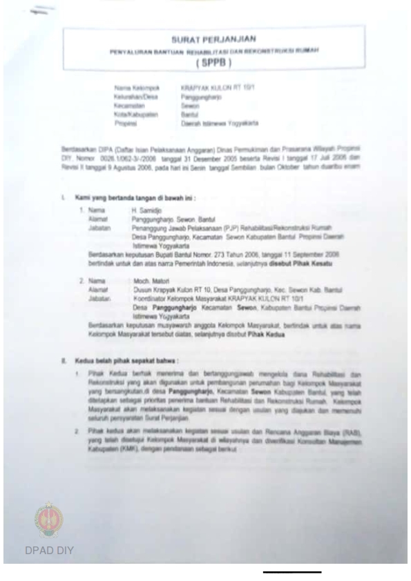 Surat Perjanjian Penyaluran Bantuan Rehabilitasi dan Rekonstruksi Rumah (SPPB), Nama Kelompok Krapyak Kulon RT 10 / 1, Kel/Desa Panggungharjo, Kecamatan Sewon, Kabupaten Bantul, Propinsi Daerah Istimewa Yogyakarta.