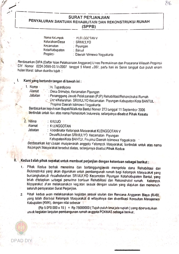 Surat Perjanjian Penyaluran Bantuan Rehabilitasi dan Rekonstruksi Rumah (SPPB) Nama Kelompok Masyarakat Klengotan 1 s.d 4 Kel/Desa Srimulyo, Kecamatan Piyungan, Kabupaten Bantul, Propinsi Daerah Istimewa Yogyakarta