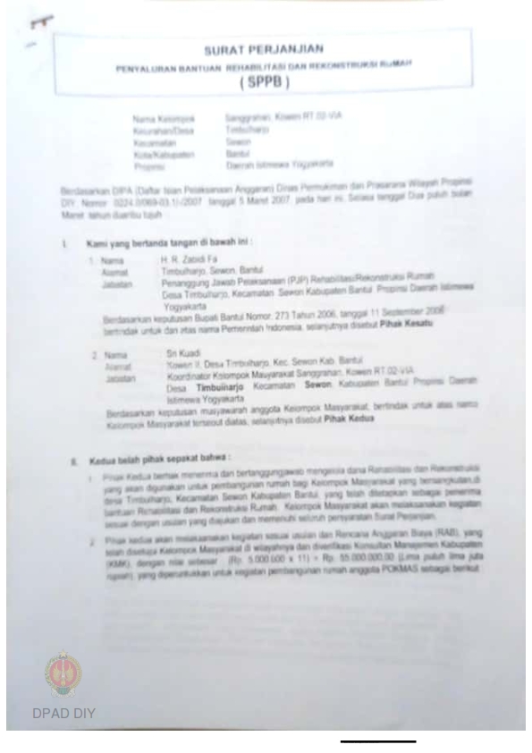Surat Perjanjian Penyaluran Bantuan Rehabilitasi dan Rekonstruksi Rumah (SPPB), Nama Kelompok Sanggrahan 1 s.d. 14, Kel/Desa Timbulharjo, Kecamatan Sewon, Kabupaten Bantul, Propinsi Daerah Istimewa Yogyakarta