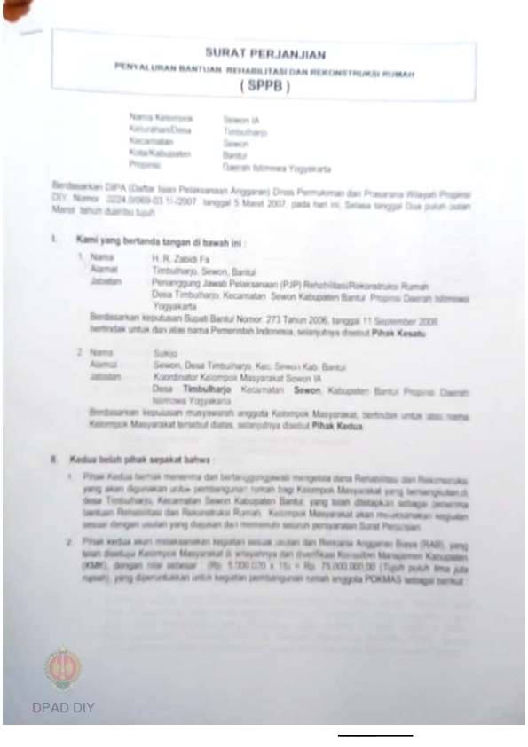 Surat Perjanjian Penyaluran Bantuan Rehabilitasi dan Rekonstruksi Rumah (SPPB), Nama Kelompok Sewon 1 s.d. 7, Kel/Desa Timbulharjo, Kecamatan Sewon, Kabupaten Bantul, Propinsi Daerah Istimewa Yogyakarta