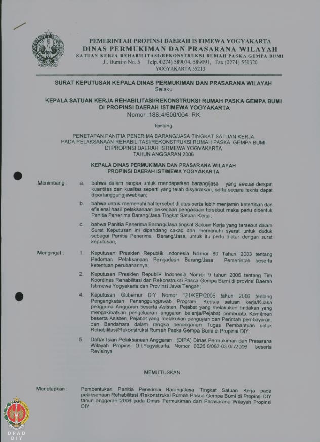 Surat Keputusan Kepala Dinas Pemukiman dan Prasarana Wilayah selaku Kepala Satuan Kerja Rehabilitasi/Rekonstruksi Rumah Paska Gempa Bumi di Provinsi Daerah Istimewa Yogyakarta Nomor : 188.4/600/004.RK tentang Penetapan Panitia Penerima Barang/Jasa Tingkat Satuan Kerja pada Pelaksanaan Rehabilitasi/Rekonstruksi Rumah Paska Gempa Bumi di Provinsi Daerah Istimewa Yogyakarta Tahun Anggaran 2006.
