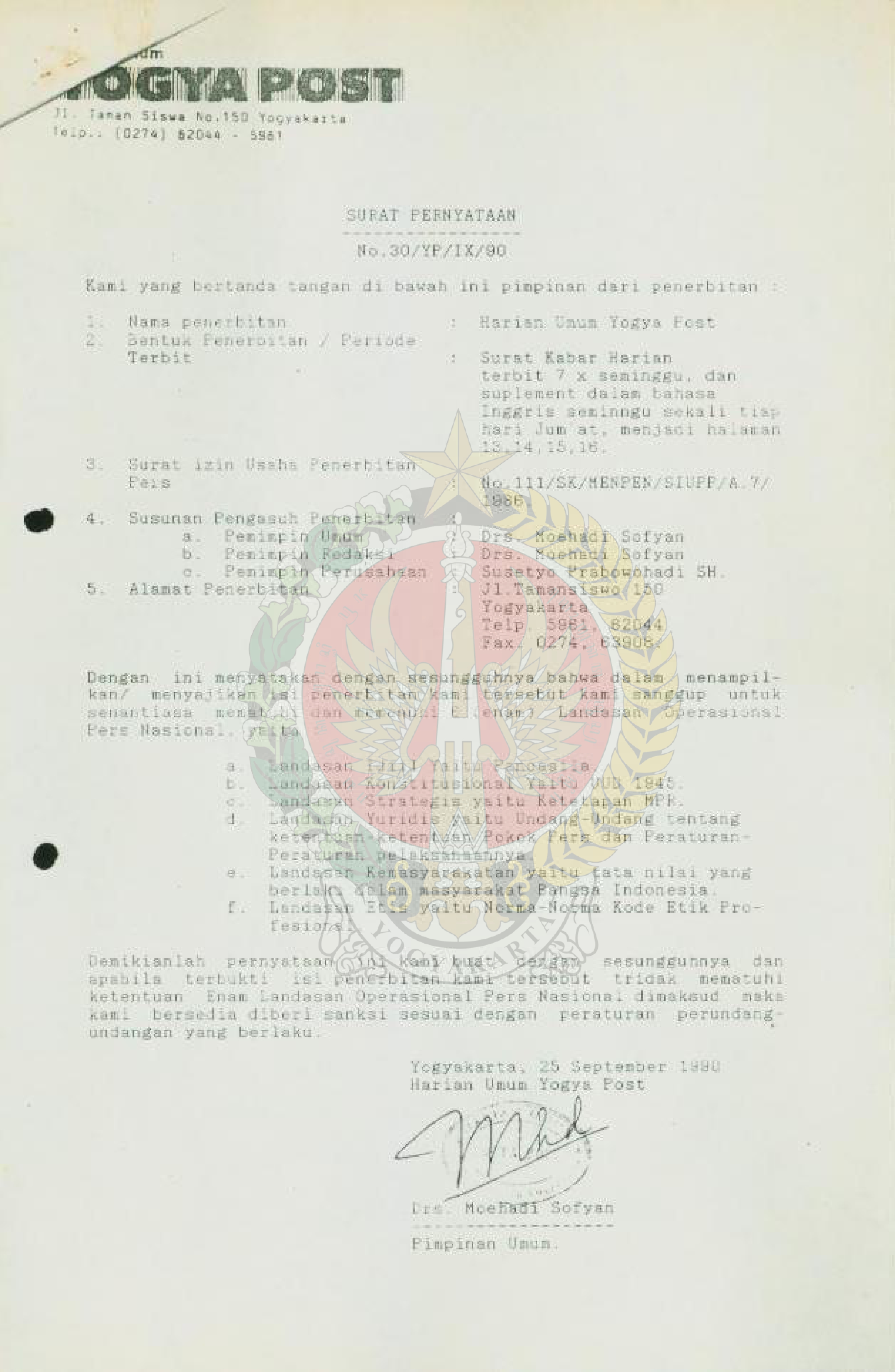 Surat Pernyataan dari Pimpinan Umum Harian Umum Yogya Post yang menyanggupi untuk mematuhi dan memenuhi 6 (enam) landasan operasional Pers Nasional