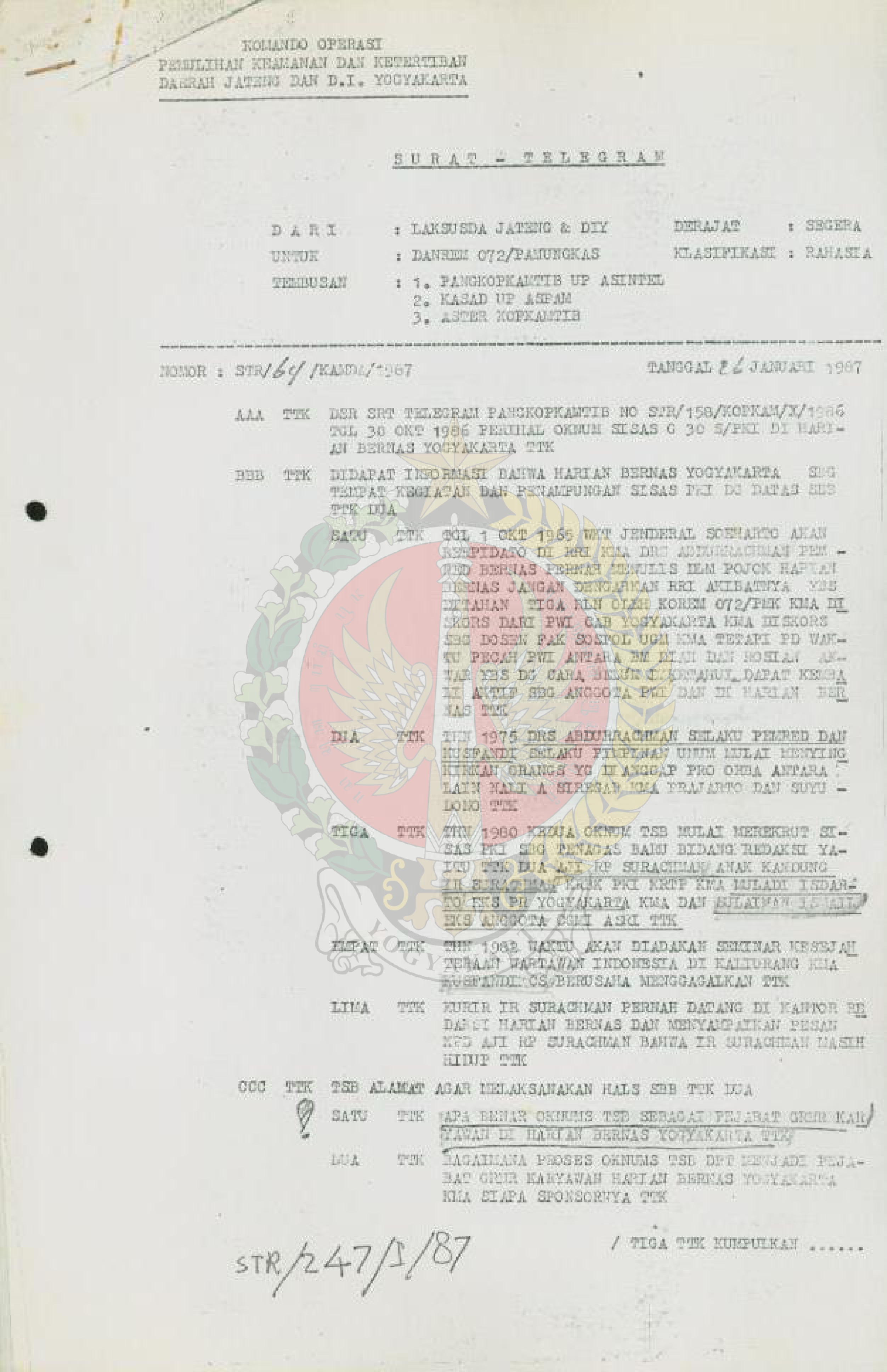 Surat Telegram dari Pelaksanaan Khusus Daerah (Laksusda) Jawa Tengah dan Daerah Istimewa Yogyakarta kepada Komandan Resort Militer 072/ Pamungkas perihal laporan bahwa Harian Bernas Yogyakarta menjadi tempat kegiatan dan penampungan sisa G30S/PKI.