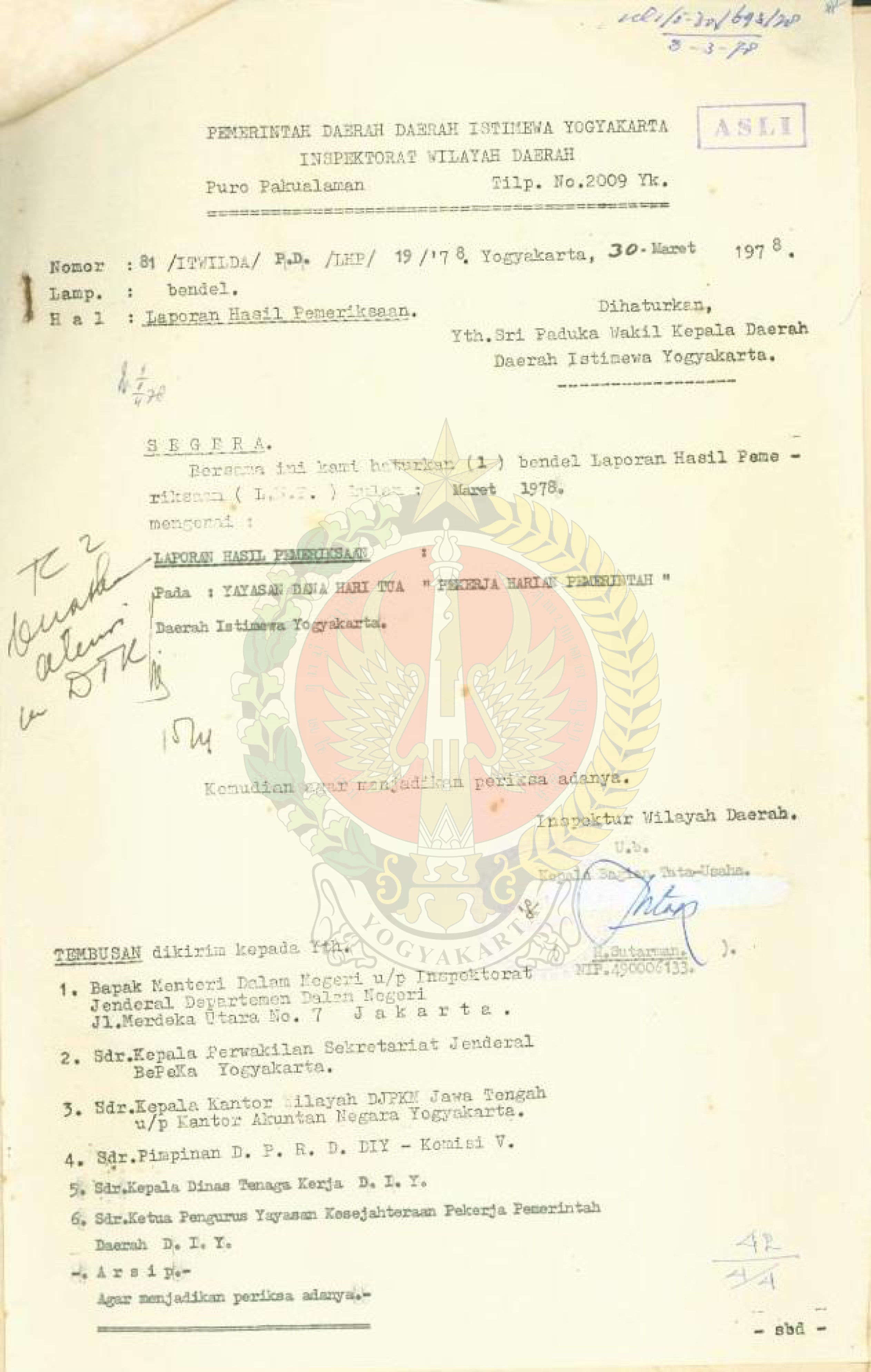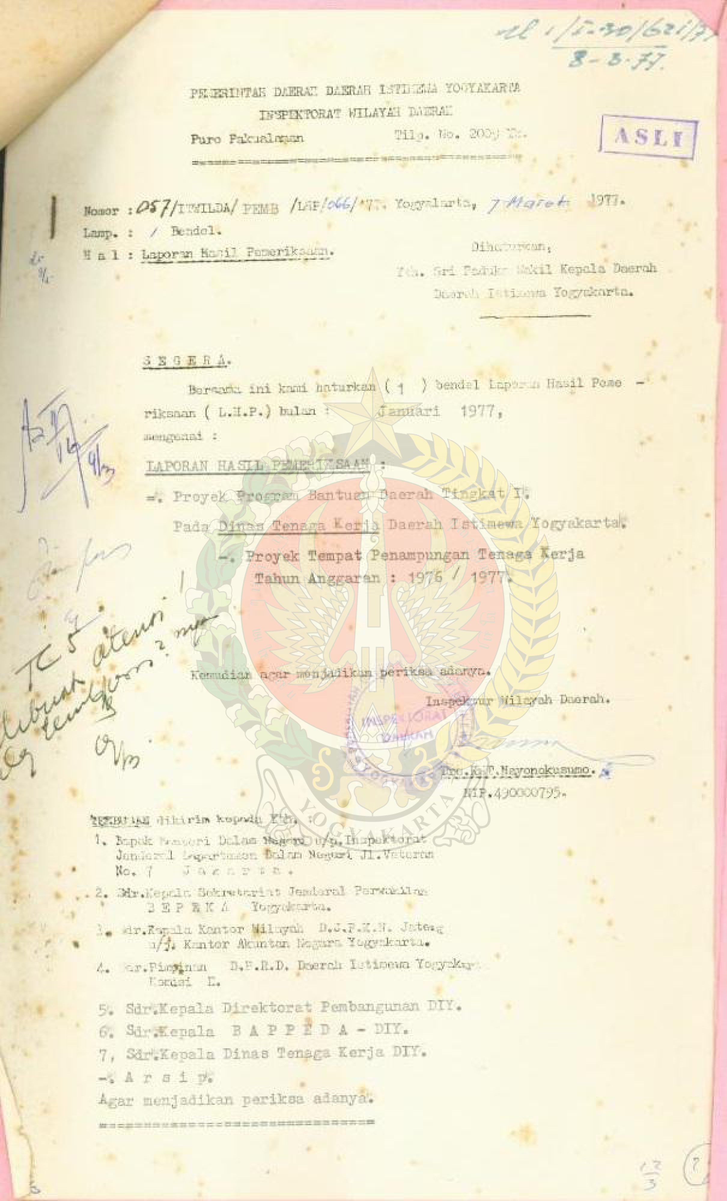 | Bpad.Orba.T15.III.I.P.2746 | Laporan hasil pemeriksaan bulan Januari 1977 proyek tempat penampungan tenaga kerja pada Dinas Tenaga Kerja DIY. | Item | 1977 - ? | Lihat | |