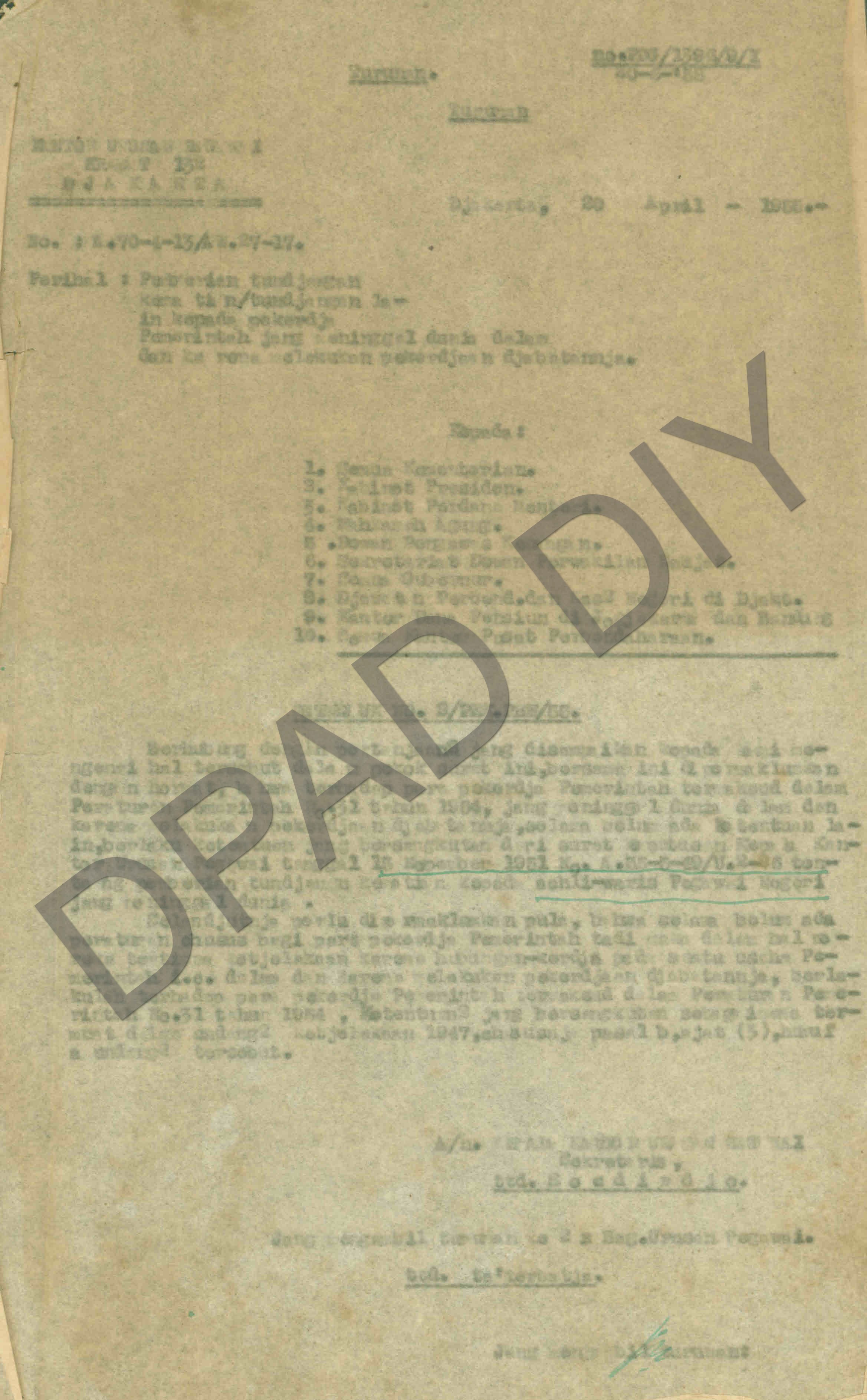 Turunan surat dari Kantor Urusan Pegawai di Jakarta tanggal 20 April 1955 Nomor : A.70-4-13/Aw.27-17 perihal pemberian tunjangan kematian/ tunjangan lain kepada pekerja pemerintah yang meninggal dunia karena melakukan pekerjaan